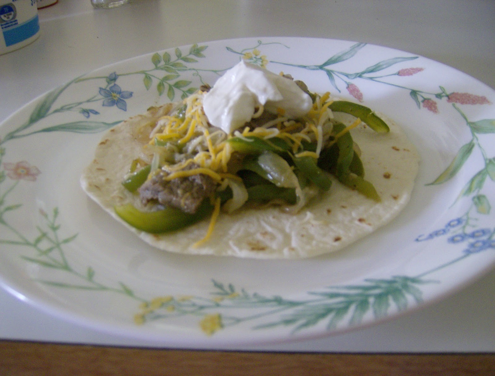 Place a damp paper towel on a dinner plate. Put the stack of tortillas on top. Place another damp paper towel over it. Microwave the tortillas for 20 seconds on high power. Take one tortilla at a time and add 1/2 cup of the steak and vegetables on the tortilla. Add some shredded cheese and sour cream. Roll up the fajitas and serve immediately. Makes 10 fajitas.